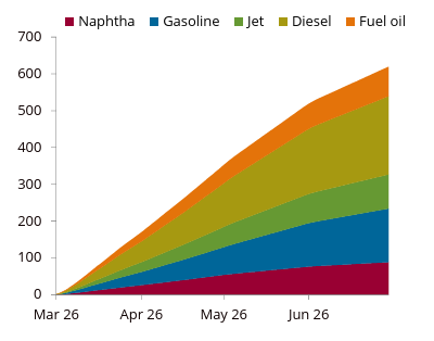 refining capacity, combined with run cuts in Asia and now Europe, has removed an enormous volume of refined product from the global market. Energy Aspects estimates that over 450 million barrels of product output have been lost since the conflict began.