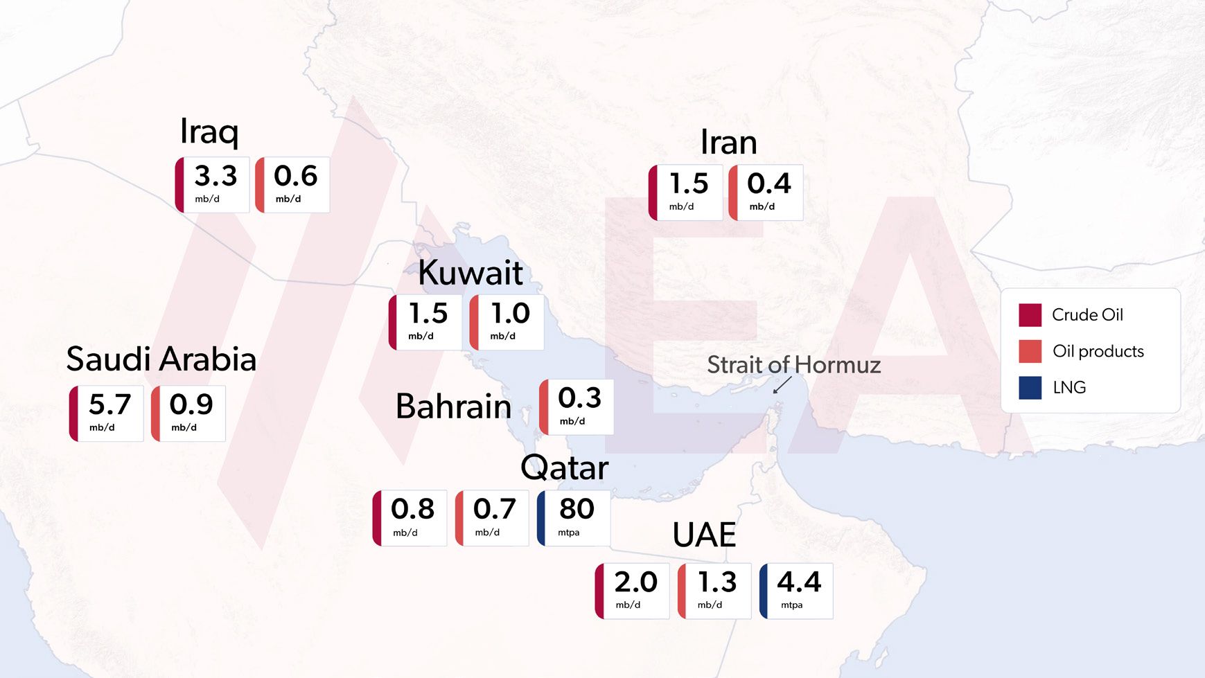 Strait of Hormuz oil, products and LNG flows, indicative export volumes by country, 2025 avg